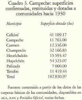 Hacia 1930 se habían confirmado, restituido y dotado 182 830.97 ha a 63 poblaciones reconocidas como comunidades, siendo la ciudad de Campeche la única que no había logrado una respuesta positiva de restitución o dotación de ejidos.27 De las comunidades que habían desaparecido dos serían refundadas nuevamente en sus asientos originales, aunque años después. Nos referimos a Samulá que vería confirmada su dotación el 15 de octubre de 1935 y se le asignarían 1 660 ha,28 en tanto que Chicbul por resolución del 9 de octubre de 1957 sería dotada con 1 250 ha29 (véase cuadro 3).