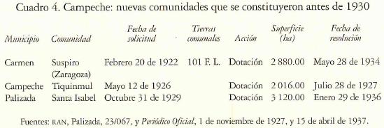 Sería hasta el año de 1934, con la expedición del Código Agrario de los Estados Unidos Mexicanos por parte de Abelardo Rodríguez, cuando los centros de población conformados por peones podrían recibir tierras de ejido.34Antes de ese tiempo sólo los centros de población reconocidos como pueblos habían tenido ese privilegio, aunque se habían organizado algunas comunidades a partir de haciendas o de forma independiente a estas, en diferentes partes del estado, como sucedió con Zaragoza (Suspiro), Tiquinmul y Santa Isabel. Nos debemos preguntar cómo fue posible que se diera la creación de estas comunidades si las leyes agrarias anteriores a 1934 no lo contemplaban. Sabemos que en primera instancia la superficie de dotación era sugerida por la Comisión Local Agraria y que se podía dar una posesión provisional. Pero esta no era la resolución definitiva, la cual expedía la Comisión Nacional Agraria; esta podía aceptar la resolución estatal o cambiarla, para dictar la resolución definitiva. Por lo tanto, el gobierno estatal no pudo ser quien otorgara la posesión a estas nuevas comunidades, pero pudo ser responsable indirectamente al proporcionar un elemento requerido para la dotación. Suspiro (Zaragoza) sería reconocida como pueblo; Tiquinmul, como "ranchería" al igual que Moch Couoh, categoría otorgada a las comunidades más pequeñas. Años más tarde, otros como Chencoyí, Haltunchén, Hobomó, San Nicolás, Kankí, Nilchí, Mucuychakán, Yaxché, entre otras, serían reconocidos como poblados, lo que podría mostrarnos la continuación de una práctica al considerar a los primeros centros de población como el continuo de la tradición del modo en que se clasificaban las comunidades políticamente. O de igual forma, la estrategia que habrían utilizado para erigirse. Al ser designadas como pueblo o ranchería adquirían un estatus legal que les daba derecho a solicitar una dotación de tierras. El paso a la designación de poblado pudo mostrar una duda de cómo se estaba considerando a las comunidades recién creadas o simplemente que ya no era necesario considerarlas como pueblos o rancherías, porque el nuevo Código Agrario de 1934 les daba la posibilidad de ser sujetos de derecho a dotación. Este aspecto nos revela la forma en que las leyes fueron utilizadas por parte de los campesinos y cuál era su objetivo principal: crear una comunidad y obtener tierras, las cuales podrían ser ampliadas con mas solicitudes a las comisiones agrarias; una actitud propia de las antiguas comunidades y que se reproduciría en los nuevos centros de población, las cuales actuarían de la misma forma (véase cuadro 4).