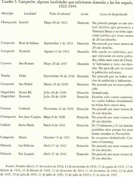 Hemos visto que desde la década de 1930 la reforma agraria empezó a darle otro aspecto al campo campechano, al sumarse otras comunidades que se formaron a partir de las haciendas. Pero no todas ellas prosperarían en sus deseos de constituirle, algunas a pesar de argumental contar con los requisitos no los cubrían, por lo cual no serían dotadas (véase cuadro 5). Una de las principales razones fue que no reunían el mínimo de habitantes con derecho a recibir el beneficio de las tierras de comunidad, que era de 20. Muchos de los reportes de cada proceso muestran que en muchas ocasiones las comunidades no existían, que tenían menos habitantes de lo que argumentaban o que se habían disuelto por otras causas, por ejemplo, una plaga de langosta que había obligado a los campesinos a emigrar.
