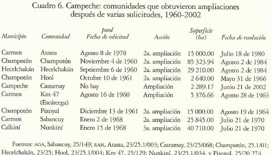Algunas comunidades solicitarían en varias ocasiones ampliación de tierras, recibiendo en una primera ocasión una respuesta negativa, para posteriormente lograr la ampliación (véase cuadro 6).51 Entre estas comunidades podemos mencionar algunas como Atasta, Castamay, Champotón, Hecelchakán, Hool, Km. 47 (Escárcega), y en especial a Bacabchén, quien haría una solicitud de quinta ampliación, siéndole negada la tercera y la quinta. A Isla Aguada y a Xculoc les sería rechazada en dos ocasiones consecutivas, sin lograr obtener una ampliación. Si bien vemos que comunidades antiguas y nuevos centros de población serían pacientes para obtener tierras, al hacer varias solicitudes, las primeras serían más constantes y, dado que tenían más habitantes, lograban obtener mayores superficies de tierras.