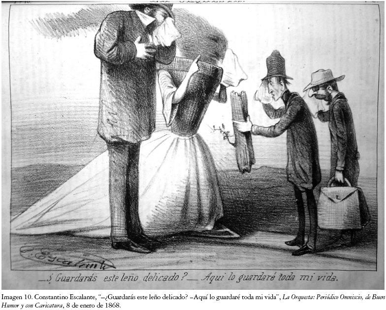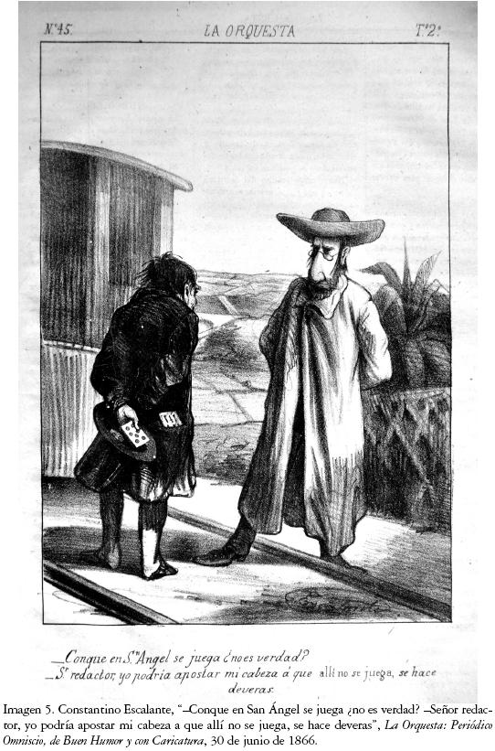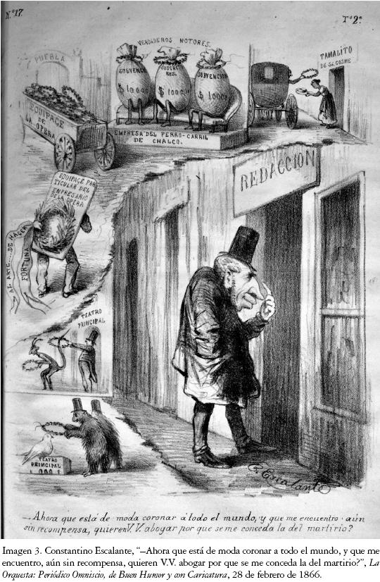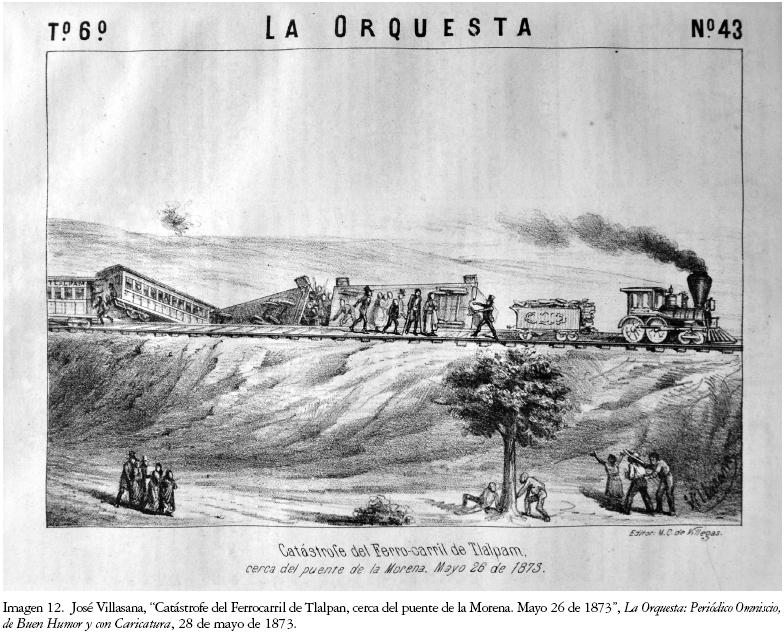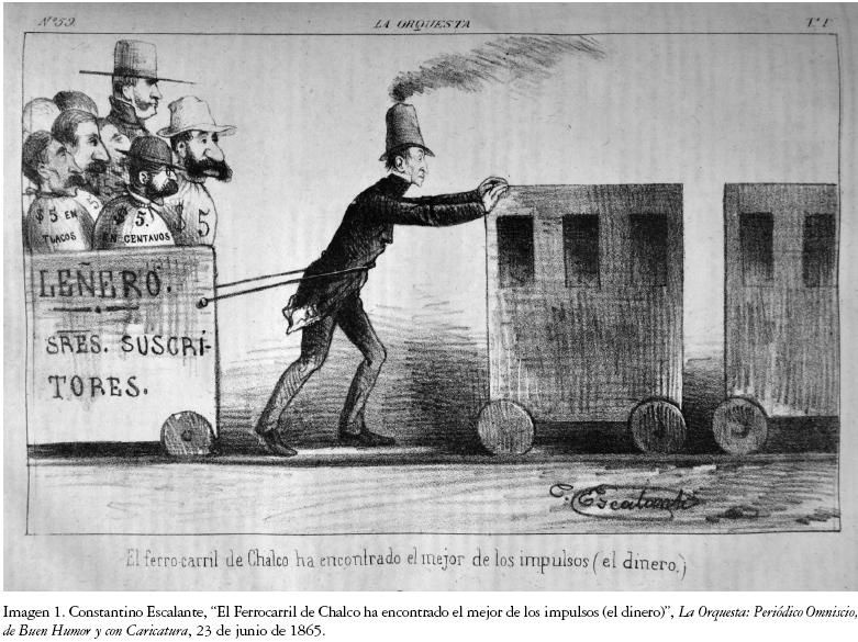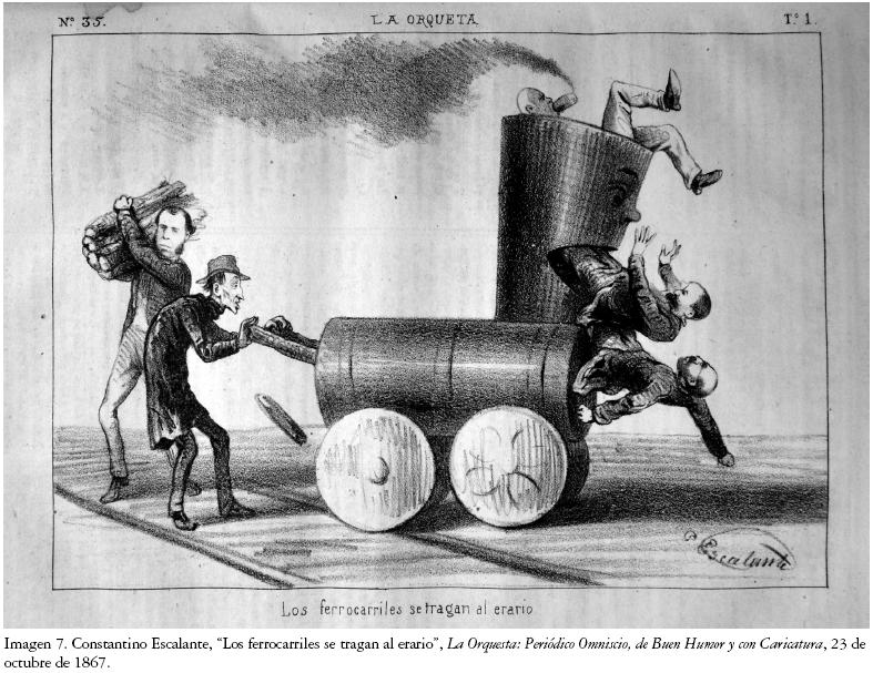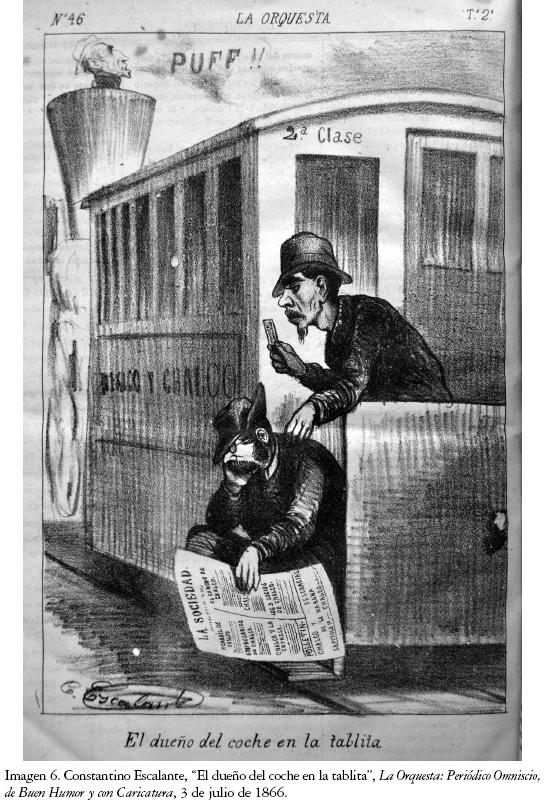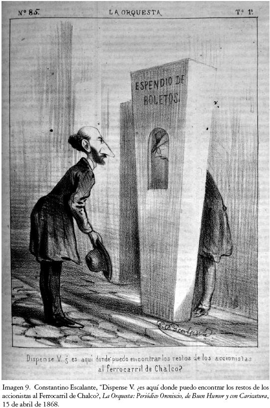 76 El Renacimiento, edición del 24 de julio de 1869, p. 417. Dice Escalante: "Señor, yo debo de advertir a usted para descargo de mi conciencia que es preciso hacer voto de paciencia y sobre todo testamento, para subir a nuestros trenes." El Impolítico sin la fecha (Ferrocarriles, Vías, 1998, p. 36); véase también La Orquesta, 26 de agosto de 1871 y 28 de mayo de 1873. No habría que olvidar que el propio caricaturista de La Orquesta, el señor Constantino Escalante, murió a causa de las heridas que le causó uno de los trenes de esta empresa. Ferrocarriles, Vías, 1998, p. 32.