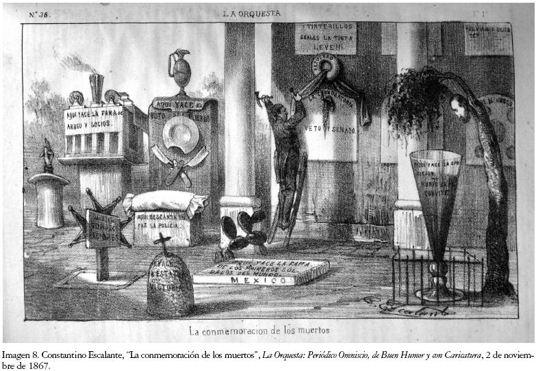 Un mes después este periódico vuelve a la carga con la imagen titulada "La conmemoración de los muertos", juntando en un cartón los difuntos más célebres del momento: la oposición, los tinterillos, la convocatoria al Congreso, el voto del pueblo, la policía, el ejército francés ("Aquí yace la fama de los primeros soldados del mundo") y "La fama de Arbeu y socios", entre otros. En un escenario que recuerda el panteón de San Fernando, los empresarios yacen bajo una original lápida: un vagón ruedas para arriba y coronado por una chimenea (imagen 8).