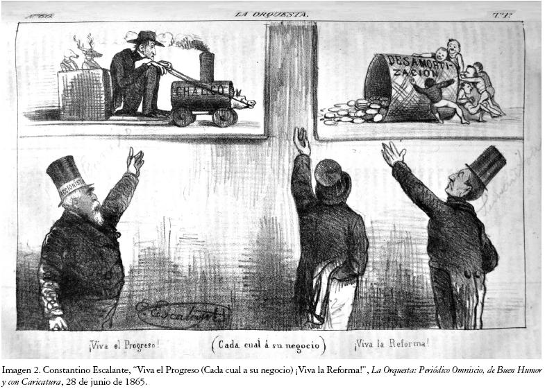 30 La interpretación de Esther Acevedo sobre esta caricatura es que "lo que se obtenía del remate de los bienes nacionalizados se invertía en el desarrollo de las comunicaciones". Acevedo, Historia, 1994, pp. 53–54.
