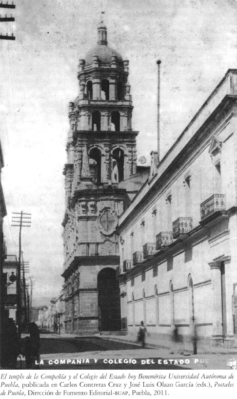 La imagen que se muestra en la portada es una tarjeta postal. La fotografía fue tomada probablemente en la década de los veinte o treinta del siglo pasado, no se conoce el nombre del autor pero se situó de sur a norte y desde la esquina de la 3 Oriente realizó su encuadre. Del lado derecho se puede apreciar el costado de la iglesia de la Compañía con su imponente torre sur, apenas se logra ver su portada barroca con sus arcos, pero lo que se distingue claramente es el arco lateral de medio punto y su reja. El primer plano es el frente del edificio de dos plantas del entonces Colegio del Estado, hoy rectoría de la buap, con sus siete balcones con herrería en la parte superior y en la inferior cinco ventanales con dos portones, cada uno al extremo de la fachada, siendo la entrada principal el portal al lado del templo. En la parte superior, justo al centro, se encuentra un asta bandera. A la izquierda de la imagen apenas se ve una parte saliente de la construcción del que fuera el hotel Jardín, hoy hotel Colonial, un poco más atrás se aprecia la esquina de la construcción que se localizada en la intersección de la 4 Norte y la calle del Ayuntamiento.[1] Se destacan unos toscos postes de luz que dejan ver las curvas propias del árbol que fue transformado en sostén de cables de energía por medio de cuatro soportes transversales en la parte superior.[2] Apenas unas cuantas personas aparecen en la imagen, algunas borrosas y al fondo se ven las casas de la acera oriente de la 4 Norte, prácticamente vacía de peatones hecho impensable hoy día. La foto fue tomada por la tarde pues la sombra del edificio del hotel Jardín cubre media calle, en la que se pueden ver las vías del tranvía que fue suprimido en 1929.[3] En el pie de la foto se anotó: “La Compañía y Colegio del Estado Pue [borroso] 38”. La fotografía seguramente formó parte de un grupo de postales de la ciudad y de ahí la identificación de las construcciones y el número.