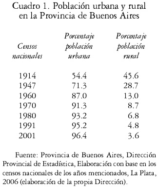 Si nos centramos en la provincia de Buenos Aires, esta contaba, según datos del censo nacional de 2001, con 15 500000 habitantes distribuidos de una manera muy desequilibrada: 96.4% en el ámbito urbano y sólo 3.6% en el medio rural. Sin embargo debemos tener en cuenta que aproximadamente 60% se concentraba en el llamado conurbano bonaerense —formado por los 24 "partidos" que rodean a la Capital Federal, de población casi totalmente urbana—, con aproximadamente 2% de una superficie provincial de 300000 km2.5 Si dejamos de lado esta zona, la población rural remonta a 9–4%, un porcentaje igualmente menor al nacional que era de 10.6% del total.6