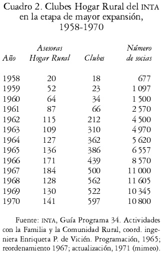Según definía el mismo INTA, el "club Hogar Rural" era "un grupo de mujeres rurales que se reúnen una o dos veces al mes. Aprenden a pensar, planear y orientar las actividades del hogar según un plan de trabajo: aprender haciendo. Desarrollan trabajos para tener un hogar alegre y feliz". Entre sus propósitos se destacaban los de perfeccionar las tareas del hogar, capacitarse técnicamente en los trabajos rurales, fomentar vocación por la vida en el campo, ayudar a solucionar problemas de la comunidad, enseñar a producir, consumir y conservar en la propia chacra, auspiciar reuniones sociales y culturales.22 A partir de los 18 clubes con que se inició el sistema en 1958 —año de la designación de las primeras asesoras del INTA— su número creció aceleradamente en una docena de años hasta casi 600, que debían en teoría distribuirse en todo el país pero que en este periodo se ubicaban casi exclusivamente en la región pampeana (véase cuadro 2).