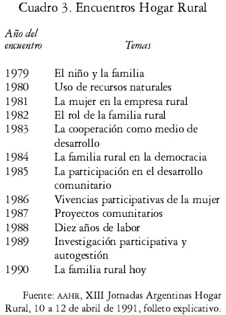 Las temáticas tratadas en esos encuentros reflejaban el cambio a escala conceptual y política ocurrido a lo largo del tiempo, marcado principalmente por la inclusión de la cuestión de la familia en la democracia en 1984. Asimismo se evidencia el retorno a un concepto participativo de la extensión hacia la familia y la mujer, que se había perdido durante los años del último gobierno militar (1976–1983), y sobresale la inclusión de los temas de desarrollo comunitario (véase cuadro 3).