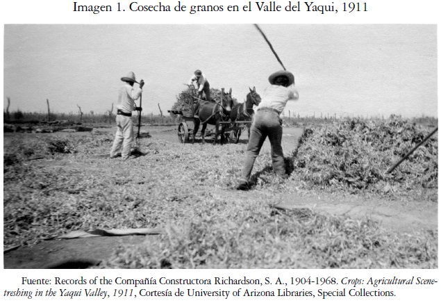 Sus predios estaban localizados en la parte inicial de la zona deltaica del río Yaqui, donde el tipo de suelo era identificado como "tierra de río o de aluvión". En esta sembraban principalmente granos: frijol, maíz, trigo, arroz y también garbanzo, para comercializar. El garbanzo era el cultivo preferido debido a su corto ciclo vegetativo.24 Producían frutas y también hortalizas para autoconsumo y para el mercado. El tomate o jitomate fue sembrado con fines comerciales cuando una compañía estadunidense refaccionó su siembra. También cultivaban tabaco, caña de azúcar y algodón.25 En la realización de sus tareas productivas estos hombres empleaban animales de tiro y un riguroso trabajo manual (véase imagen 1).