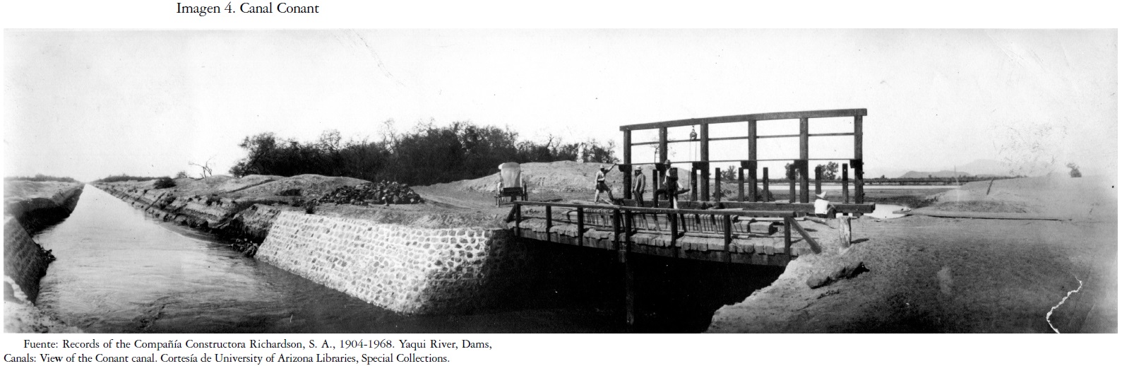 61 Quinientas hectáreas de esta superficie le habían sido concesionadas a Carlos Conant en los últimos años del siglo XIX, y en 1893 él "abrió un canal en la orilla izquierda del río Yaqui", el canal Conant que derivaba el agua de la margen izquierda en las proximidades del pueblo de Tórim, aguas arriba y a corta distancia del canal Vícam, González, Sociedad, 1994, p. 58, y Dabdoub, Historia, 1964, p. 288.