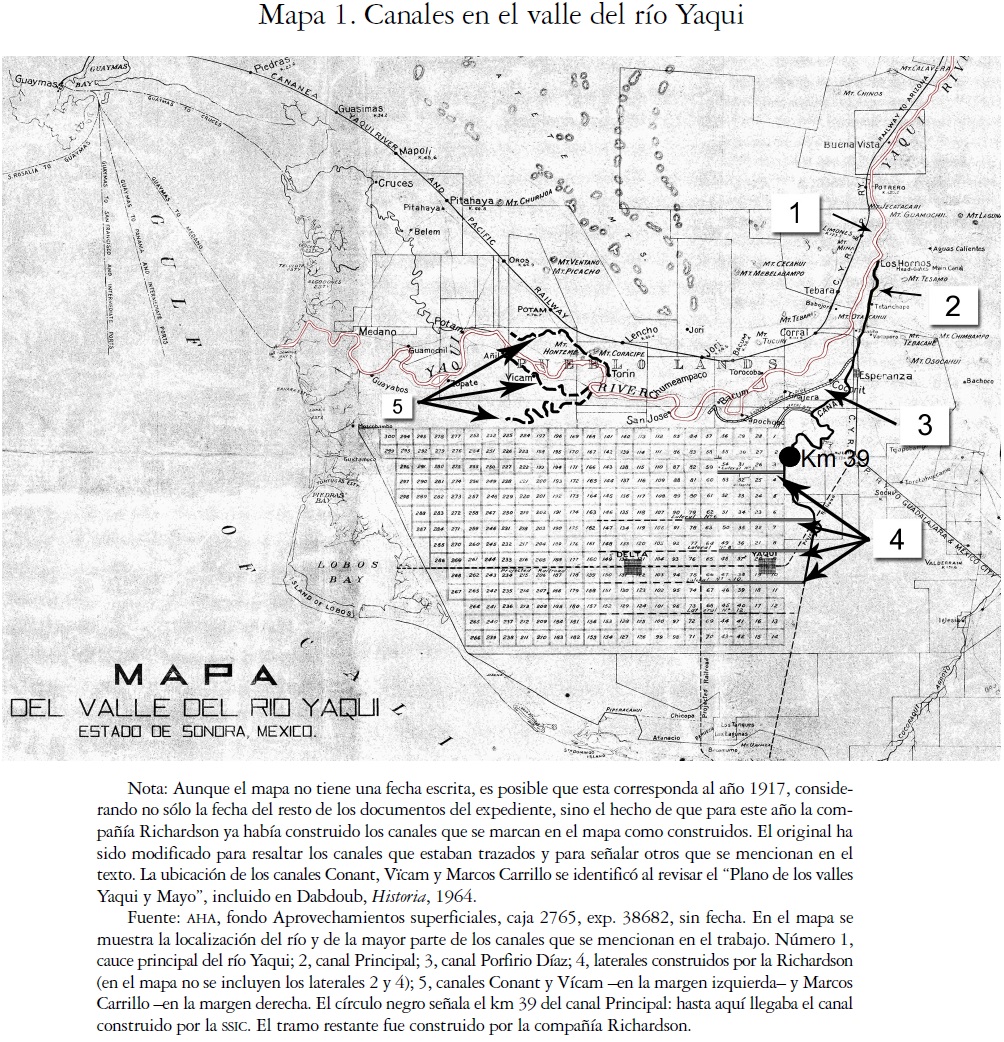 59 Propietarios de terrenos de la margen derecha del río Yaqui al secretario de Fomento, 30 de marzo de 1911, en AHA, fondo Aprovechamientos superficiales, caja 1051, exp. 14808, f. 41; Water Concession of Compañía Constructora Richardson, S. A. of Sonora, Mexico, en <http://content.library.arizona.ed/ Richardson>.