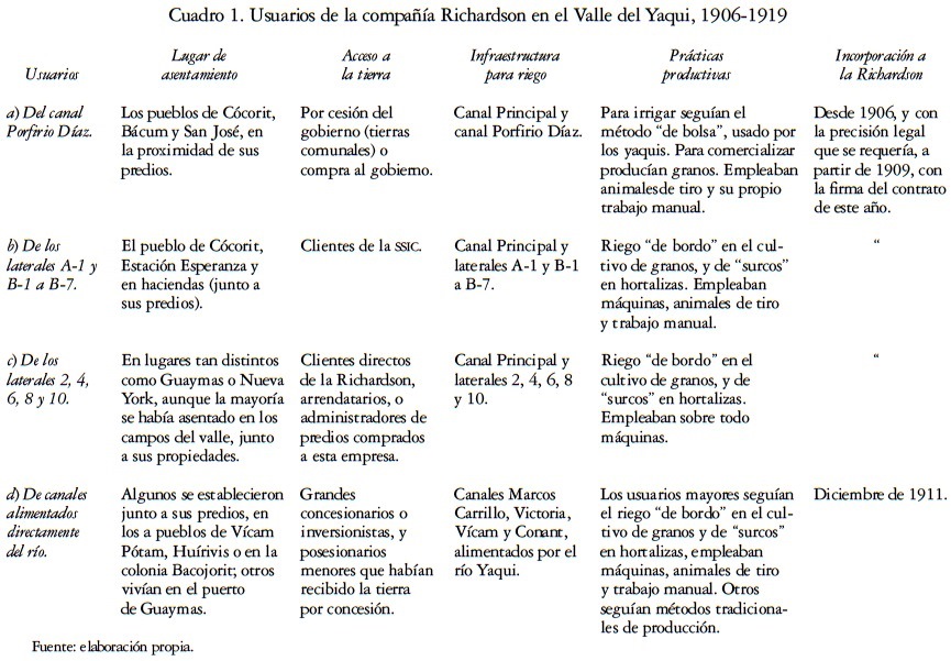This article provides a sociocultural description of the users of the Richardson company during its administration in the Valle de Yaqui in Sonora. Its construction was based on the premise that there were no substantive differences between water and irrigation infrastructure users regarding their access to water and land, the location of their land in the territory, their production practices and the characteristics of their relations with this US company. We have grouped together and compared these elements, which involved inequalities in productive development, in order to grasp the existing diversity among the farmers in the valley at the time and determine how their agricultural production practices changed.