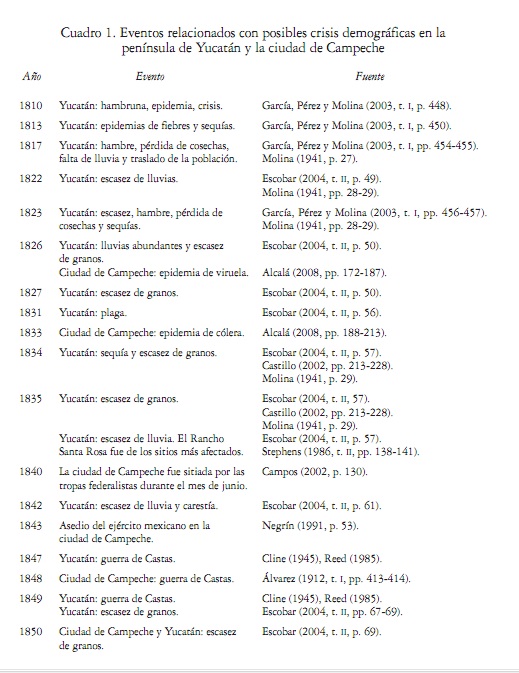 Cuadro 1. Eventos relacionados con posibles crisis demográficas en la península de Yucatán y la ciudad de Campeche