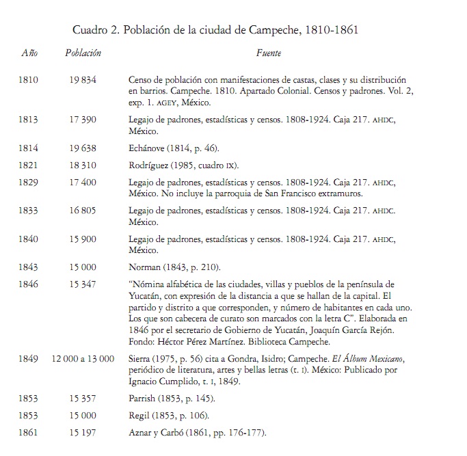 Para finalizar, considero que la principal aportación de este trabajo consiste en un primer ejercicio para explicar la relación entre diversos acontecimientos que influyeron en las variables demográficas de Campeche, así como las dificultades que presentan las fuentes relacionadas con los estudios de población. En este punto, esto responde a la necesidad que han planteado diversos investigadores en relación con los estudios locales. Reduciendo la escala de observación, sería interesante el estudio individualizado de estos fenómenos para un mayor análisis de la dinámica poblacional de esta localidad.