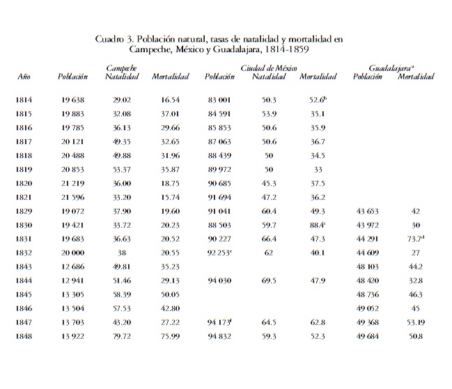 Cuadro 3. Población natural, tasas de natalidad y mortalidad en Campeche, México y Guadalajara, 1814-1859