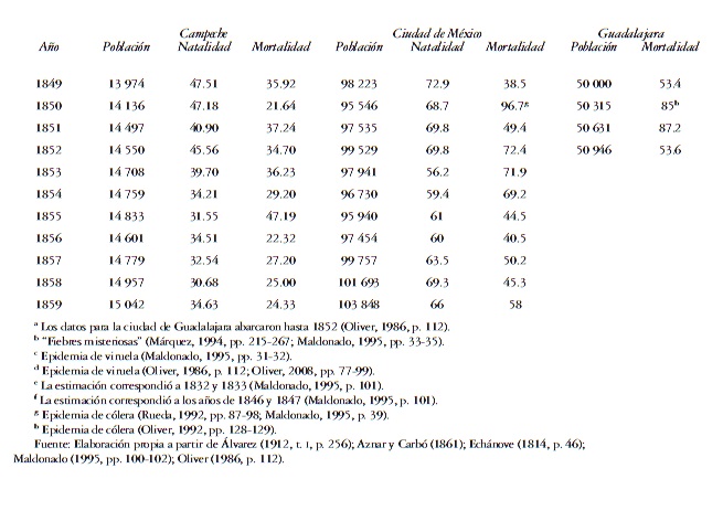 Victoria Lerner (1968, p. 335) y Robert Mc Caa (1993, pp. 90-113) señalaron que durante el siglo xix y las tasas de natalidad y mortalidad fueron elevadas, situación que provocó un crecimiento lento de la población. Esto se debió principalmente a epidemias, hambrunas, conflictos bélicos y fenómenos migratorios. Por fortuna, estas no fueron tan devastadoras como las que se presentaron durante la dominación española (Mc Caa, 1993, p. 101).