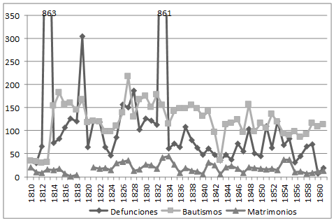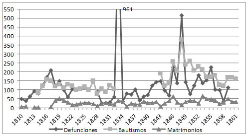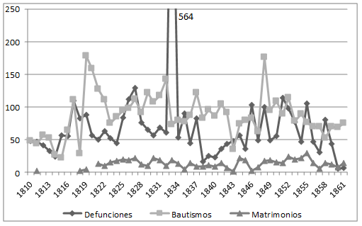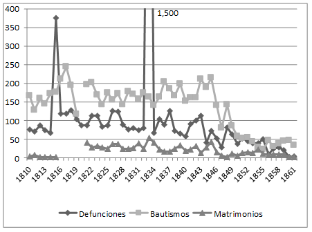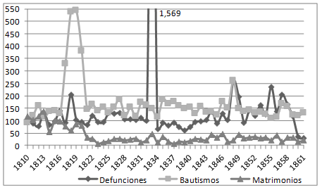 [50] Desafortunadamente no contamos con los datos de bautismos. Aun así, el incremento de la mortalidad fue notable en comparación a otros años.