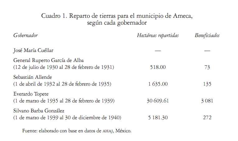 La reforma agraria y agrícola fue obligada por las condiciones sociales que vivía el país y los campesinos, pero rechazada contundentemente por el hacendado y los gobiernos estales y municipales. De ahí que muchas veces los hacendados coludidos con las autoridades impidieron el reparto de tierras en los primeros años y poco o nulo caso se hiciera a las recomendaciones del ejecutivo, como la anteriormente citada de Pascual Ortiz Rubio. Cuando Lázaro Cárdenas llega a la presidencia de la república fue que el proyecto agrario tuvo sus mejores resultados; en Jalisco, el gobernador Everardo Topete tuvo que sumarse a dicho reparto ante la presión del presidente de la república y de los movimientos sociales que pugnaban por este bien. Así, durante el periodo del gobernador Topete, se dotaron la mayor cantidad de tierras en el estado, como se ve en el cuadro 1.
