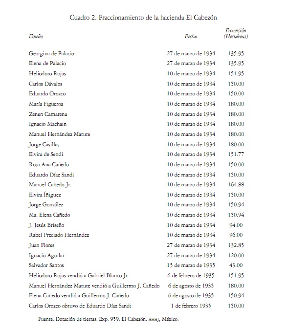 Otra estrategia de Cañedo para eludir la afectación de la reforma agraria fue el fraccionamiento de la hacienda. Supuestamente hizo la venta de fracciones de tierras pertenecientes a la hacienda de El Cabezón a diferentes compradores, pero en la relación de nuevos propietarios sólo se encuentran amigos, familiares directos o políticos como se observa en el cuadro 2.