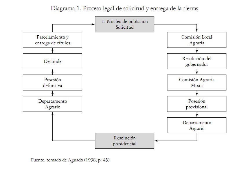 La reforma agraria en México se exigió desde el Plan de Ayala de Emiliano Zapata en 1911. Para lograrla se expidieron leyes desde enero de 1915 y se elevó a rango constitucional en 1917. En el artículo primero de la ley de Ejidos publicada el 8 de enero de 1921 (siendo presidente Álvaro Obregón) se estableció el derecho a obtener tierras por dotación o restitución en toda la república para disfrutarlas en comunidad en tanto no se legislara sobre su fraccionamiento. En esta misma ley, el artículo 13 estipulaba que la tierra dotada a los pueblos se denominaría ejido y tendría una extensión suficiente, de acuerdo con las necesidades de la población, la calidad agrícola del suelo, la topografía del lugar, etc. Se consideraba también que el mínimo de tierras de una dotación sería tal, que cada jefe de familia podría generar una utilidad diaria equivalente al doble del jornal medio en la localidad (Aguado, 1998, p. 41).