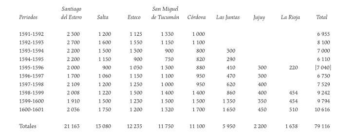 Con independencia del número de habitantes, la villa de las Juntas destacó a finales del siglo xvi por la rapidez en el crecimiento de sus diezmos. Como vimos, el diezmo del obispado presentó una tendencia al alza, acentuada a partir de 1595-1596. Fenómeno debido a un incremento importante en lo recaudado en las ciudades de Córdova, San Miguel de Tucumán y Nueva Madrid de la Juntas, en el periodo 1598-1599.