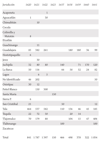 Cuadro 1. Repartimiento por año de indios en Nueva Galicia por jurisdicción, siglo xvii