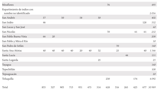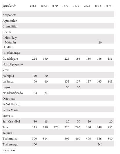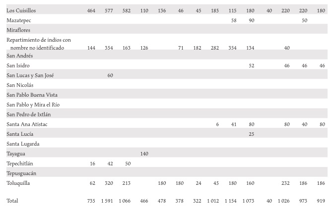 20 El peso de aportar trabajadores de repartimiento recayó en más de 60 pueblos. Entre los que más indios enviaron fueron los de Cajititlán, Cuyutlán, Tlajomulco, Tonalá, Tequila, Toluquilla, Tala, San Agustín, Nestipac, Tesistán, Poncitlán, Mesquituta, Moyahua, Tlaltenango, Teul, Apozol, Jalpa, Mecatabasco, etcétera.