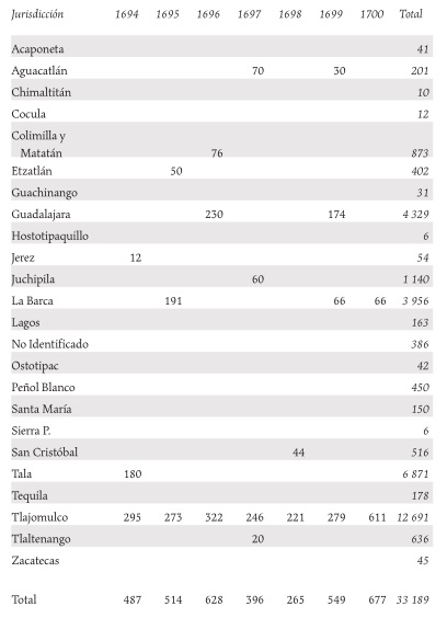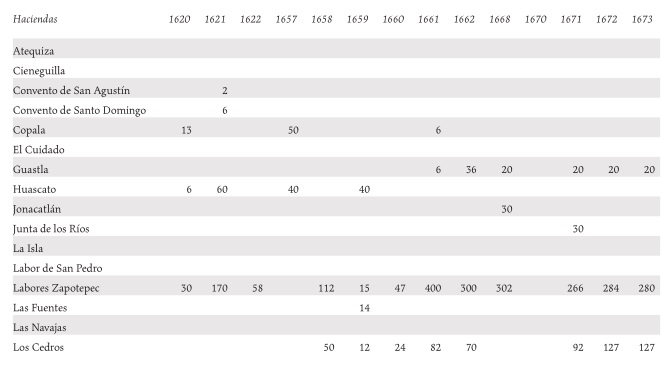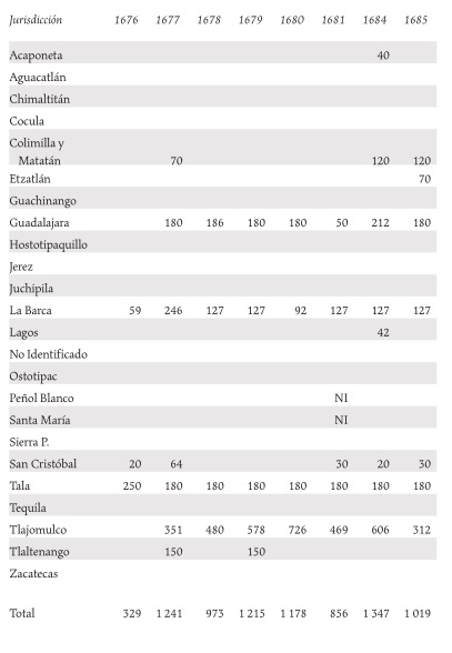 El análisis que aquí se hace sobre la relevancia de la mano de obra indígena de repartimiento en el cultivo del trigo está respaldado en 540 concesiones que se otorgaron específicamente para ese fin a distintos agricultores a lo largo del siglo xvii. Todas las haciendas que recibieron este beneficio se ubicaban en un radio no mayor de 90 kilómetros de Guadalajara; las más cercanas a esa ciudad como las de Cuisillos, Toluquilla, Zapotepec y Mazatepec fueron las que más indios recibieron. A algunas otras, que no estaban dentro de Nueva Galicia, también se les otorgó este tipo de mano de obra, como en Etzatlán, que pertenecía a Nueva España, o Cocula, que era de la Provincia de Ávalos.20