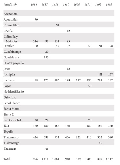 Estos nuevos datos combinados con otras fuentes cualitativas me permiten hacer un análisis más completo sobre la historia del cultivo del trigo en el siglo xvii. Coincido con los anteriores autores en cuanto a la dependencia que tuvo la siembra y cosecha de este cereal de la mano de obra indígena, pero me aparto y difiero en algunas de sus conclusiones y reflexiones, en particular de la del profesor Van Young (1989, p. 249), cuando plantea la idea de que en el siglo xvii son escasos los registros de repartimiento en Nueva Galicia y que la documentación empieza a abundar alrededor de 1685, cuando la institución ya estaba moribunda. La anterior sentencia no tiene fundamento pues existen numerosos registros de repartimientos de indios desde 1620. De ninguna manera este sistema laboral estaba moribundo, justo en la década de los ochenta de aquel siglo fue cuando se dieron las mayores asignaciones de mano de obra, en particular los años de 1688 y 1689.