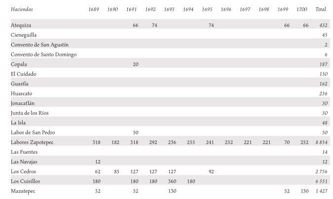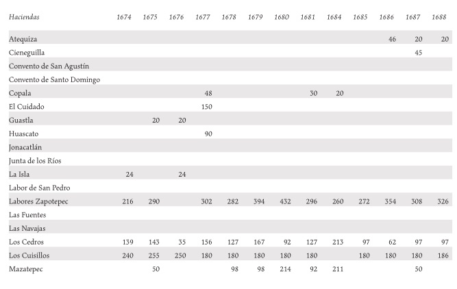 Mención aparte merece un grupo de cuatro propiedades ubicadas en dos de los valles más fértiles de ese reino, en la jurisdicción de Tlajomulco, el de Mazatepec y el de Zapotepec. En su conjunto, estas concentraron la mayor cantidad de repartimientos en todo el siglo. De hecho, juntas representan 38% del total de asignaciones que tenemos registradas para esa centuria. Las analizo en conjunto porque pertenecieron durante más de 100 años a una misma familia. Cuatro hermanos eran los propietarios de ellas y posteriormente los hijos de cada uno de ellos las continuaron administrando hasta mediados del siglo xviii. Por la continuidad de los repartimientos de indios a ellas, se deduce que fueron las mejor protegidas por parte de las autoridades debido a su cercanía con Guadalajara y como una forma de asegurar el abasto de trigo o harina a ella. Al menos desde 1671 y hasta los primeros años del siglo xviii no hubo una sola ocasión en que se quedaran sin trabajadores para las labores del trigo. A cada uno se le entregaba anualmente un promedio de 85 hombres, divididos en las temporadas de siembra y cosecha (véase cuadro 2).
