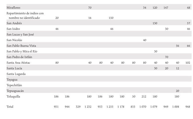 Algunos pueblos, incluso, fueron forzados a llevar las herramientas de trabajo. Así les pasó a los de Tlajomulco, San Agustín, Santa Cruz, Santa Ana Tepetitlán, San Sebastián, Toluquilla y Analco, que aportaban carretas a la hacienda de Los Cuisillos.16 Los del pueblo de Jomulco, en la jurisdicción de Aguacatlán, tenían la obligación de llevar los bueyes y los aperos necesarios para la siembra.17 De modo que además de la mano de obra, los propietarios se veían bastante beneficiados al ahorrarse el desgaste de herramientas y de animales. Todo esto justificado por la dependencia de Guadalajara de las cosechas de trigo,18 o como lo expresó el presidente de la Audiencia de aquella ciudad cuando se negó en 1671 a reducir el número de indios repartidos del pueblo de Tequila “pues de esto depende el sustento de esta ciudad y del reino”19 (véase cuadro 1).