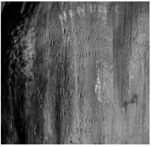 Velázquez de León afirma que recorrieron la caverna por espacio de siete horas y media, con la intención de llegar hasta los confines del sitio. Pudieron reconocer toda la galería y comprobaron que no había ningún río que atravesara la cueva, y que los monumentos colosales que hay en los últimos salones podían rodearse y volver al mismo camino que los condujo desde la entrada, es decir, confirmaron que la única salida era por donde habían accedido a la gruta. También dieron cuenta del difícil camino, por “los grandes y separados peñascos que a diversos niveles forman un pavimento escabroso y resbaladizo en muchas partes, en razón de la arcilla humedecida que los cubre, principalmente ya al concluir la vuelta para volver a encontrar el cañón principal” (“La caverna de Cacahuamilpa”, 1850, p. 62). Hoy en día pueden verse en uno de los últimos salones los nombres de Velázquez de León y sus acompañantes, labrados en la roca, una prueba irrefutable de su presencia en el lugar (véase imagen 2).
