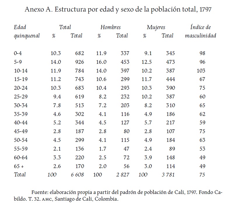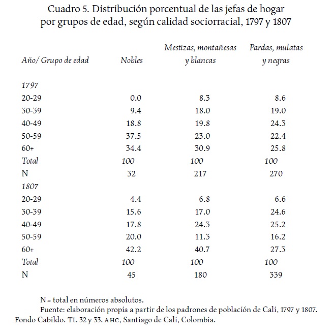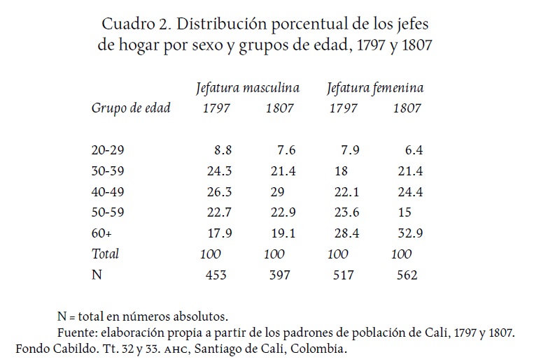 17 Todos los promedios y porcentajes que se mencionan en este apartado provienen de cálculos propios basados en los padrones de población de 1797 y 1807. Fondo Cabildo. Tt. 32 y 33. ahc, Santiago de Cali, Colombia.