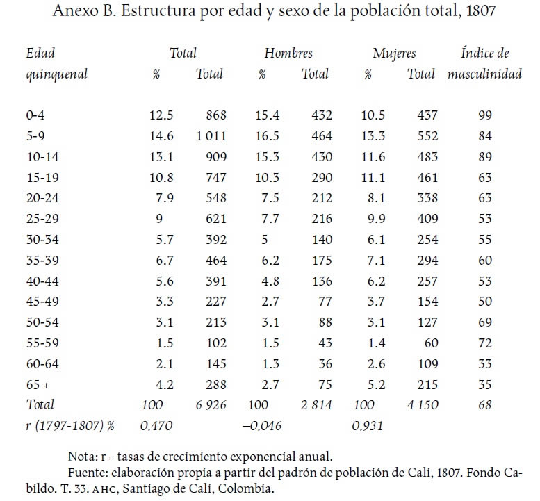 Además de la mayor sobrevivencia de las esposas, la emigración de los hombres en edad productiva a las haciendas o minas es una posible explicación para el incremento de las jefas adultas. En la estructura por edad y sexo de 1797 (anexo A) se observa una caída muy marcada en la población masculina en edades jóvenes (desde los quince años en adelante). Mientras el índice de masculinidad de los diez a los catorce años se coloca en 103 hombres por cada 100 mujeres, el de los quince a 19 años se ubica en 67 hombres por cada 100 mujeres. En 1807, también se observa una caída en el índice de masculinidad entre los diez y los catorce años y entre los quince y los 19 años, de 89 hombres por cada 100 mujeres a 63 hombres por cada 100 mujeres (anexo B). En general, se observa una tasa de crecimiento positivo de la población femenina de Cali cercana a 0.9% anual entre 1797 y 1807, pero esto no ocurre entre los hombres, entre quienes se estima una caída de –0.5% anual en el mismo periodo.