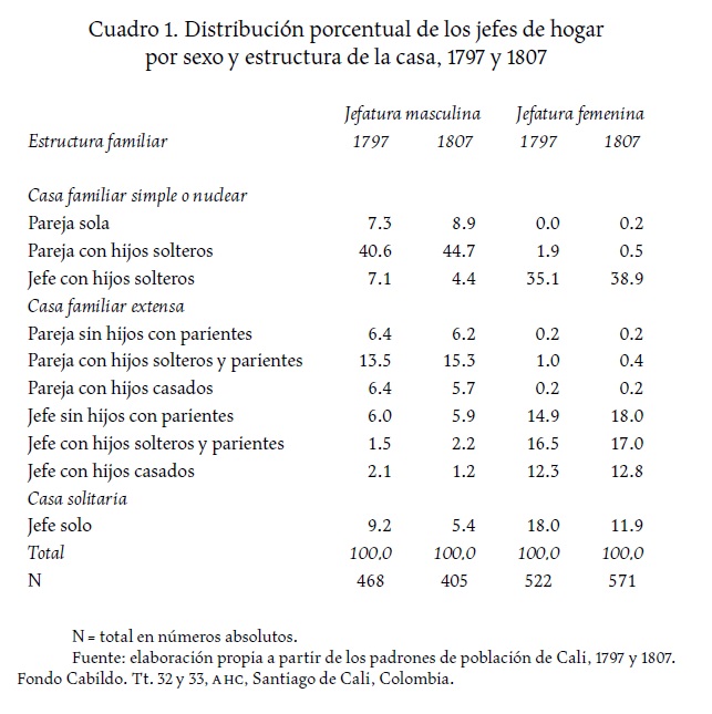 El objetivo general de este trabajo es describir el cambio en la jefatura femenina de los hogares de Cali, Colombia, por condición sociorracial1 a finales del periodo colonial, a partir de los padrones de población de 1797 y 1807,2 así como en las características demográficas de las jefas de hogar de acuerdo con esta condición. Se identifican la edad, el tipo de hogar, la presencia de hijos en el hogar, el número de hijos y el estado civil de las “cabezas” de familia para el total de los jefes de hogar diferenciados por sexo y para las jefas según su condición sociorracial.