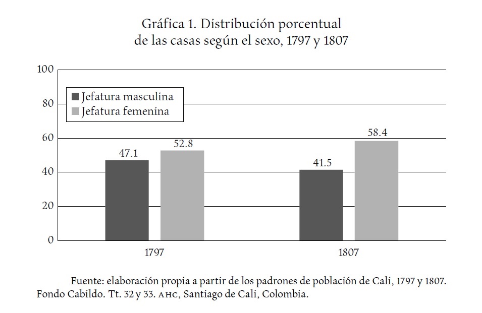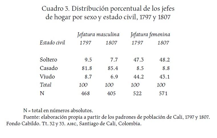Paradójicamente, en este contexto una gran proporción de hogares llegaban a ser encabezados por una mujer en las ciudades neogranadinas (Rodríguez, 1991, p. 22). En Cali, en 1797, el porcentaje de hogares donde la cabeza de familia era mujer, era muy alto, como veremos adelante. Las mujeres llegaban a ocupar esta posición no por elección propia, sino ante las circunstancias externas. Se sabe que las viudas representaban un segmento numeroso de las jefas de familia blancas y entre las castas; un grupo muy notable eran las jefas que eran madres solteras y que no convivían con los padres de sus hijos (Rodríguez, 2004, p. 249).