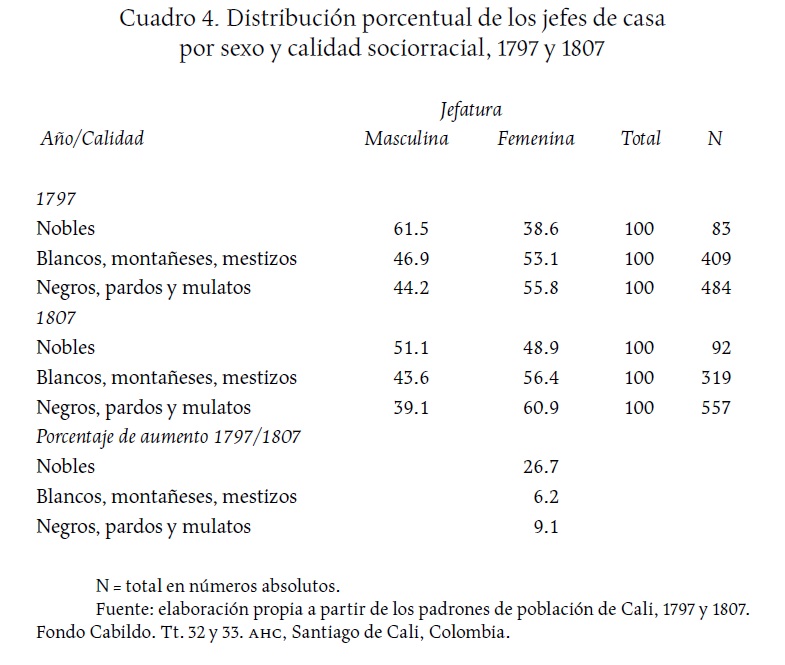 No obstante, entre 1797 y 1807, las jefaturas femeninas aumentaron en Cali no sólo entre las castas sino en cada una de las calidades sociorraciales (cuadro 4). Los hogares encabezados por mujeres nobles se incrementaron de 39 a 49%, es decir, en 1807 las nobles registraron un nivel de jefatura femenina 26.7% superior al observado en 1797, el cambio relativo más alto de la década.