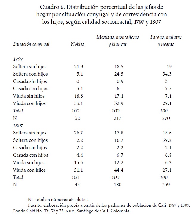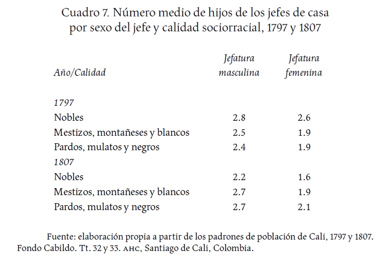 Entre 1797 y 1807, en Cali, las madres solteras se incrementaron aún más entre las jefas de las castas hasta alcanzar 39.2%, en contraste a la disminución de las madres solteras entre las jefas de otras calidades. Si bien no podemos establecer una relación causal entre estos resultados y la Real Pragmática de los matrimonios, las limitaciones impuestas al cruce interracial pudieron haber favorecido la expansión de la barraganía y de madres solteras entre las castas de ascendencia negra.28