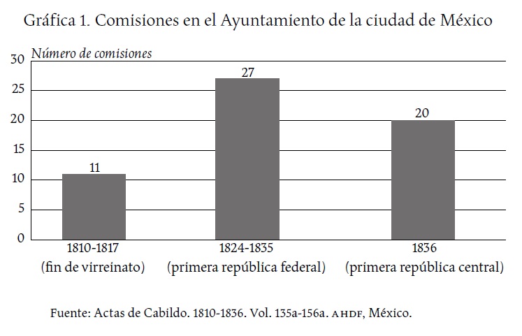 El incremento de las comisiones del Ayuntamiento de México fue una respuesta de la complejidad que la propia ciudad fue presentando en el primer tercio del siglo xix, no sólo a causa del incipiente crecimiento poblacional, sino también por las tareas administrativas que la municipalidad debía cubrir; en cierta forma se dio una especialización en varios quehaceres administrativos. Al finalizar el virreinato había alrededor de once comisiones, en la primera república federal 27 y en la primera república central se redujeron a 20. En varios casos, las comisiones cambiaban de nombre aunque las tareas municipales continuaron siendo las mismas. No obstante, se trató de hacer más eficiente la gestión administrativa, aunque aún con muchos tropiezos.