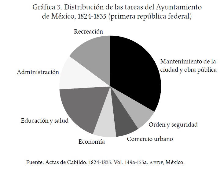 Nuestra lectura apunta a que en la primera república federal se especializaron los quehaceres del Ayuntamiento en relación con el virreinato. Vale la pena señalar que años antes del surgimiento de la primera república federal, particularmente entre 1821 y 1823, los temas de gobierno y administración que la Diputación Provincial y el Ayuntamiento tenían bajo su jurisdicción, ya proponían separar ciertos rubros: Hacienda pública; Tierras y aguas; Obras públicas y mejoramiento social; Seguridad pública; Instrucción pública y Proceso electoral (Salinas, 2011, pp. 90-91). Sin embargo, fue hasta 1824 cuando se formalizó.