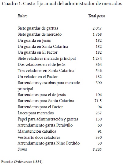 Para el cargo de administrador general de mercados se destinó un apartado específico en las Ordenanzas; uno de los requisitos era contar con seis fiadores de 2 000 pesos, uno de ellos sería nombrado administrador segundo en caso de que faltase el primero y necesitaba tener tres fiadores. Ambos cargos eran vitalicios. El gobernador tenía “facultades para removerlos de sus cargos en caso de incumplimiento de sus deberes, por falta de fiadores o por quiebra”. El administrador debía entregar informes mensuales al Ayuntamiento. Para elegir al administrador, el Ayuntamiento presentaba al gobernador y a la Junta Departamental las solicitudes de los aspirantes en sesión de Cabildo, y por votación se elegía al ganador. El sueldo del administrador general de mercados “por única indemnización y sueldo, disfrutará el diez y ocho por ciento de la total recaudación efectiva”, siendo de su cuenta los que se muestran en el cuadro 1.