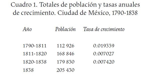 A finales del siglo xviii en la capital de Nueva España se reportaron 112 926 habitantes (Orozco y Berra 1973, pp. 71-75); para 1811 el padrón arrojó un total de 168 846 habitantes. [8] Diez años después, de acuerdo con Navarro y Noriega (1943), aumentó a 179 830 habitantes. En 1838 el total de la población de la ciudad de México ascendía a 205 430 personas (Bustamante, 1851). El crecimiento de la población entre 1790 y 1811, utilizando las fuentes citadas, fue de 1.93% anual. El ritmo de crecimiento fue de 0.70 en el lapso comprendido entre 1811 y 1820. En el periodo siguiente, de 1821 a 1838, casi no hubo cambio, la tasa fue de 0.74% (véase cuadro 1). En la realidad no se trataba de una población estacionaria, supuesto demográfico donde el número de nacimientos y muertes son iguales y no existía migración, lo que no ocurrió, pues el proceso de inmigración a la ciudad era un fenómeno constante desde años atrás, como se mostró antes.