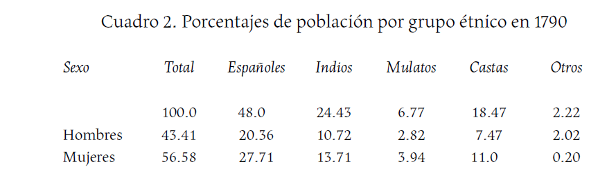 Cuadro 2. Porcentajes de población por grupo étnico en 1790