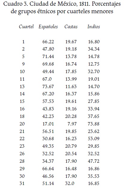 A partir del padrón de 1811 tenemos un análisis más detallado acerca de la composición de la población por grupo étnico y su distribución en cada uno de los cuarteles. Resalta el predominio de la población española, tanto peninsular como criolla, en la parte central de la ciudad, en particular en los cuarteles 1, 5, 9, 11, 13, 14 y 29. La población indígena se distribuía en los cuarteles 20, con 73.88%, de indígenas y el 22 y el 28, con porcentajes de alrededor de 50%. Las castas no rebasaban 20% en los distintos cuarteles, a excepción del 30 (véase cuadro 3). No existía una clasificación rígida en cuanto a los grupos étnicos. Brading (1972, p. 461) afirma que los individuos en el México colonial eran muy sensibles a la designación “racial”, más bien biológica, que se les daba. [9] Es probable que se basaran en el fenotipo para los grupos indígena, africano y español, pero la distinción en cuanto a características físicas de las castas o de los mestizos, como también se les llamaba, era cuestión muy difícil. [10]