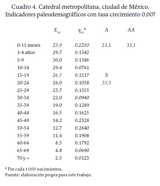 Cuadro 4. Catedral metropolitana, ciudad de México. Indicadores paleodemográficos con tasa crecimiento 0.007