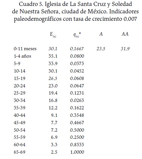 Cuadro 5. Iglesia de La Santa Cruz y Soledad de Nuestra Señora, ciudad de México. Indicadores paleodemográficos con tasa de crecimiento 0.007