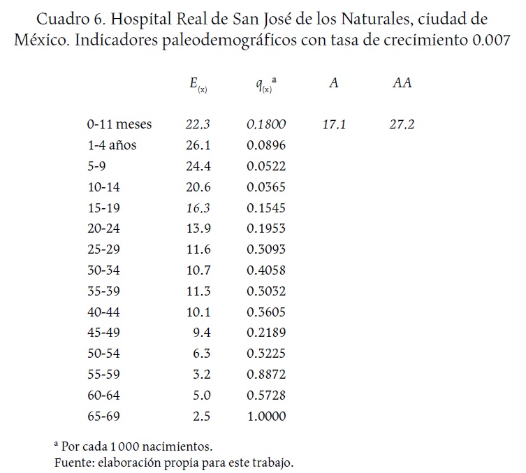 Cuadro 6. Hospital Real de San José de los Naturales, ciudad de México. Indicadores paleodemográficos con tasa de crecimiento 0.007