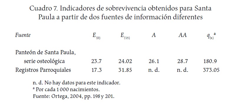 El ejercicio desarrollado por el autor señala que los datos no son comparables, pero la información obtenida a partir de una y otra fuentes tiene el valor de proporcionar un acercamiento a partir de dos perspectivas metodológicas diferentes de lo que fue el perfil demográfico de un sector de población que habitó la ciudad de México en el siglo xix. Por ejemplo, dada la subrepresentación de infantes en la serie osteológica, la mortalidad calculada para los menores de un año es de 180.9 defunciones por cada 1 000 nacimientos, lo que se considera bajo para las condiciones sanitarias y de salud de la época; en cambio este indicador, calculado a partir de la información de los registros de defunciones, revela que la mortalidad de menores de un año en la parroquia de Santa María la Rivera era 373.4 defunciones por cada 1 000 nacimientos, cifra muy alta pero que concuerda con las crónicas de historiadores de la ciudad de México, con los estudios específicos sobre mortalidad infantil en otros sectores de la población y con lo que los historiadores de la población llaman niveles de mortalidad infantil en sociedades del antiguo régimen demográfico. [20]