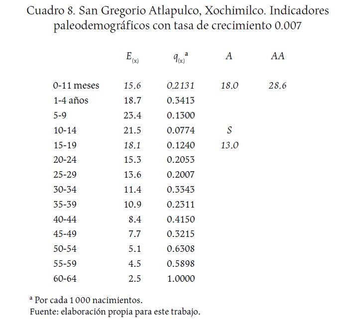 Cuadro 8. San Gregorio Atlapulco, Xochimilco. Indicadores paleodemográficos con tasa de crecimiento 0.007