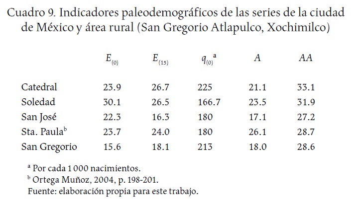 Cuadro 9. Indicadores paleodemográficos de las series de la ciudad de México y área rural (San Gregorio Atlapulco, Xochimilco)