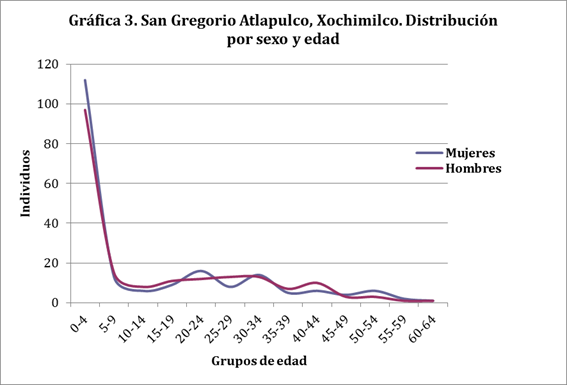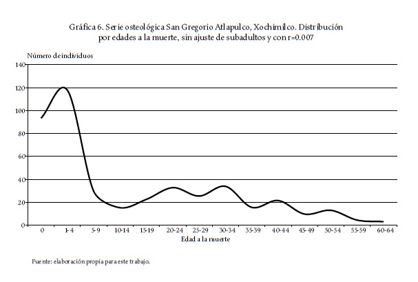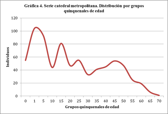 Esta serie osteológica cumple con el requisito metodológico de representación de individuos en todos los grupos de edad –desde recién nacidos hasta mayores de 70 años– para ejecutar un estudio paleodemográfico. No separamos los restos por sexo en los individuos menores de quince años, ya que es necesario el esqueleto completo para este procedimiento, por lo que la distribución sólo se presenta por grupos de edad mixtos, es decir, no todos los grupos de edad están agrupados en quinquenios [14] (véase gráfica 3).